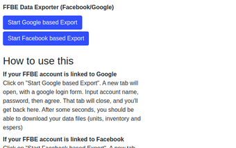 FFBE Sync, Final Fantasy Brave Exvius oyuncularına yönelik bir Firefox eklentisidir. Bu araç sayesinde kullanıcılar, oyun içi verilerini kolayca yönetebilir ve fan yapımı sitelere aktarma imkanı bulurlar. Oyuncular, giriş yöntemlerini seçerek oturum açar ve ardından birim koleksiyonu, envanter ve esper verilerini içeren üç ayrı dosya indirebilirler.